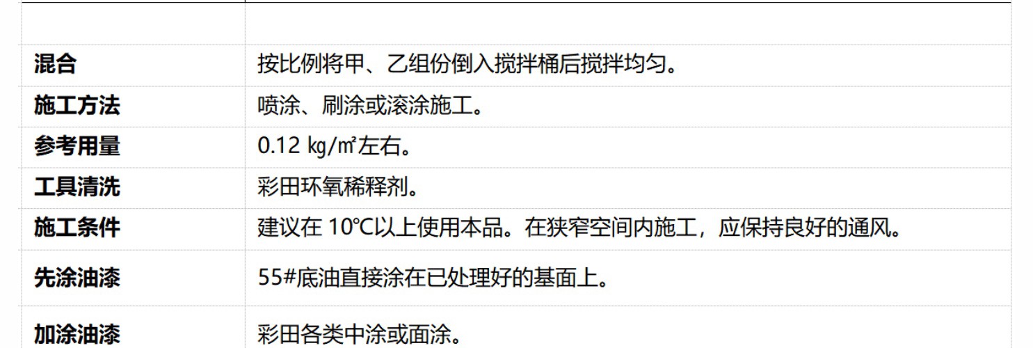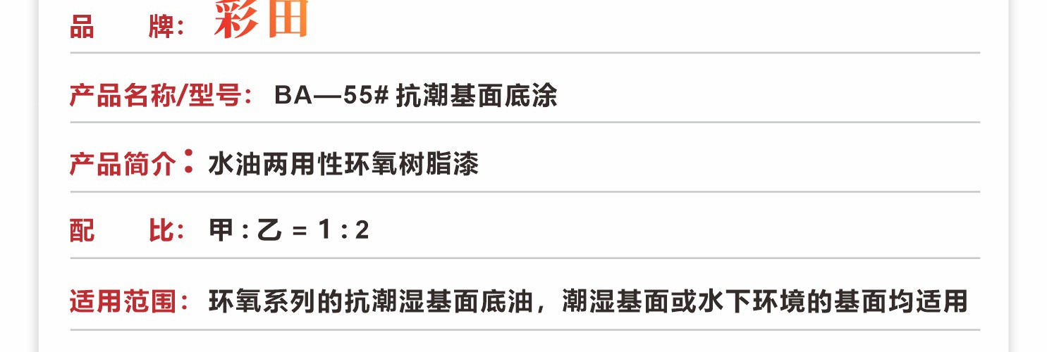 彩田BA-55#底油,是利用分子結構設計原理,采用特殊原料和生產工藝,合成的一種特殊結構適應潮濕或者水下環境條件下使用的高強度的特殊改性環氧底油;在水下或者潮濕環境中極具穿透水膜能力而使得漆膜具有強烈的浸潤粘結與固化性能,其固化物粘結強度同干燥環境下相比較保持率達到95%以上;特別適合用在潮濕基面或水下環境中。