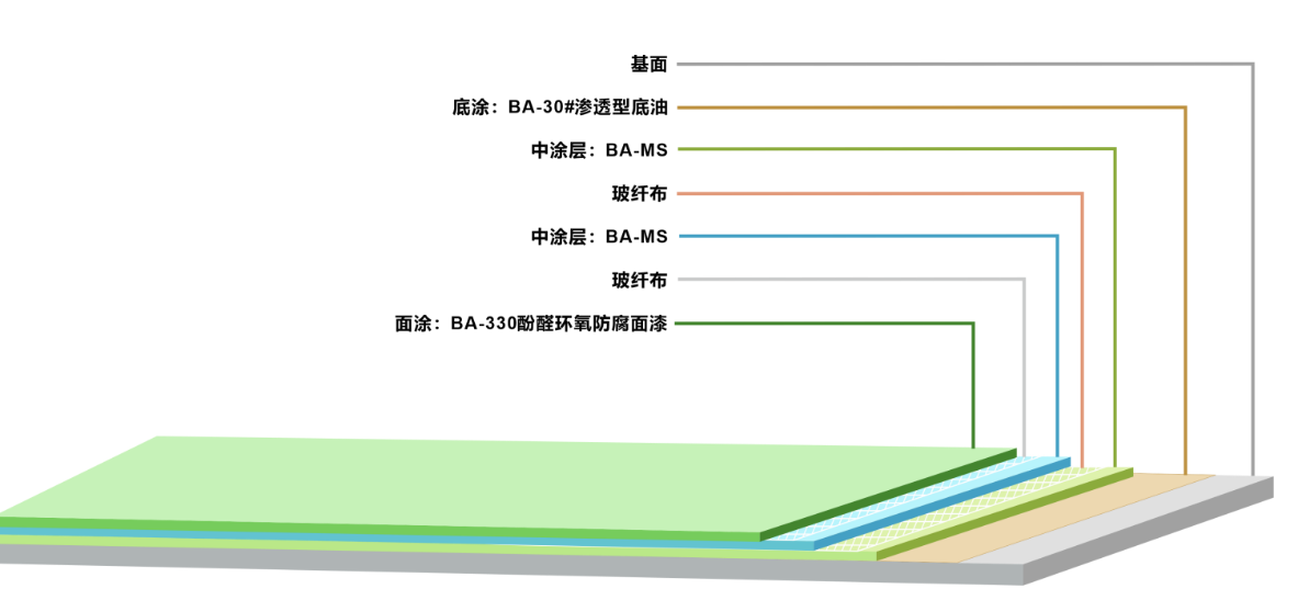 中涂層:彩田BA-MS防腐中涂+玻纖布