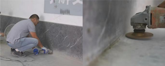 使用空鼓錘將所有施工地面空鼓部分找出,并利用切割機切開,電錘將地面鑿開并利用高倍中涂砂漿予以補平,完全固化后再用手磨機細打至平整。