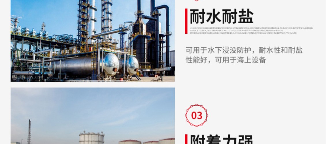 厚漿雙組份聚酰胺固化環氧煤焦瀝青涂料,固化后可形成具有優異的耐水性和柔韌性漆膜,可耐磨損、耐海水、耐原油和燃油等,本品不僅具有環氧漆類的堅硬、耐磨和耐化學品性能,而且具有瀝青漆類的耐水特性。